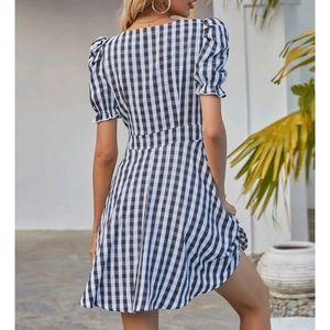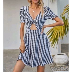 Black & White Color Casual Gingham Ruffle Cut Out Tie Front Zipper A Line Summer Deep V Neck Puff Sleeves High Waist Flared Fabric has no stretch 100% Polyester