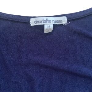 Charlotte Russe Navy Ruffled Romper with Pockets Size M. Excellent condition. Low cut front with knitted keyhole opening. Ruffles around hem and two side slit pockets. Super soft material. Elastic band across back waist.