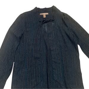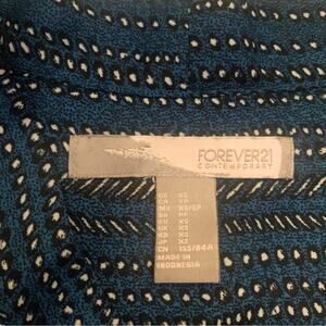 Teal blouse with small white dot and stripe print by Forever 21 Contemporary. Size XS. Long sleeves. Self tie neck. You can tie a knot, bow or wear as is. Long peasant sleeves with buttoned cuffs. Polyester fabric. Perfect for work or business events. You can also wear it for casual or elegant looks. Classic. Elegant. Like new.