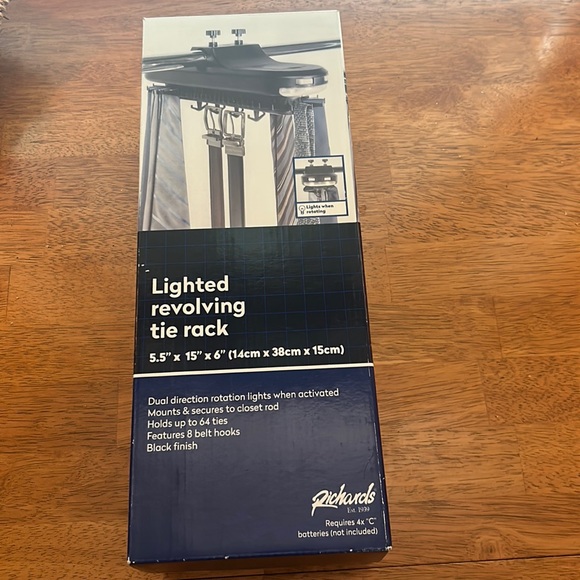 Lighted Revolving Tie Rack. Uses 4 “C” batteries. Great for organizing ties. Brand new, never used.