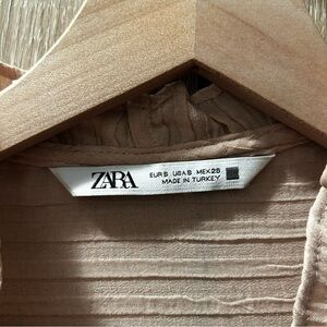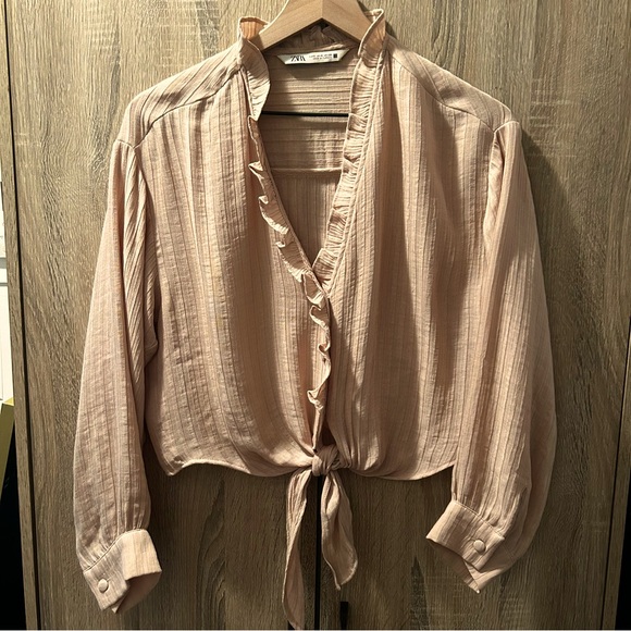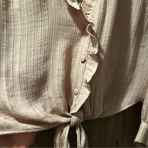 Boho chic front tie ruffle blouse with covered button detail and feminine neckline. Blush/peach color. In great condition- perfect with a long skirt and biker boots for a very Free People look!