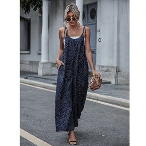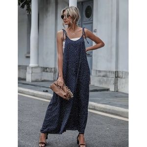 Tie Shoulder Polka Dot Navy Blue Wide Loose Fitting Jumpsuit