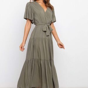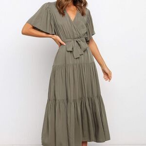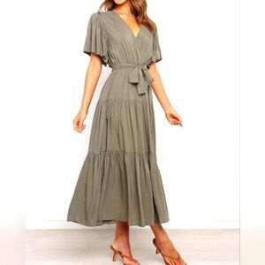 Tie Waist Tiered Short Sleeve Midi Dress Butterfly Sleeve Dark Olive