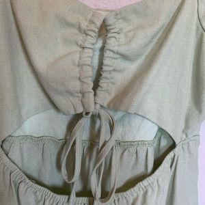 Light green, puff sleeve, dress that ties in the back. The back has a cute keyhole detail but the tie can adjust how tight it is across the chest. Hangs a few inches above knees