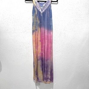 Preowned tie-dye maxi dress features a beautiful blend of purple, pink, and yellow hues. It's perfect for a relaxed day at the beach, by the pool, or during vacation. It offers a stylish and comfortable fit. ONE SIZE