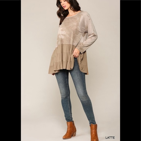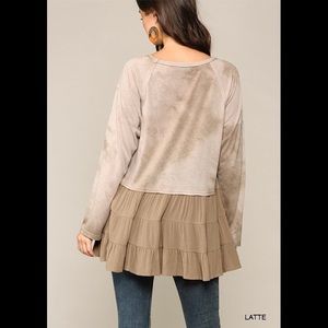 Tie dye knit and solid woven mixed top with ruffle hem. 70% polyester, 30% Rayon