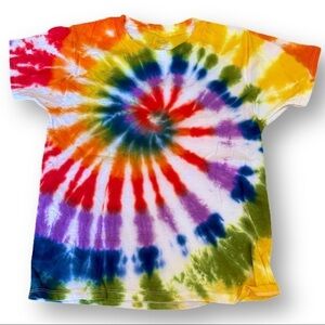 Tie dyed kids’ tshirt size S. Iconic spiral pattern in rainbow colors really pops. Lots of intentional white space makes the colors really pop! Professional grade dye won’t fade. A stunning piece for the kid who is not afraid of making a statement. Brand new; tags removed for dyeing.