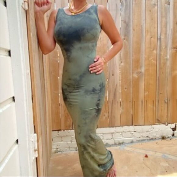 Tie dyed green khaki maxi dress Very stretchy material Would fit a small medium CB