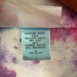 This is a vintage men's Kings Road (Sears) cream-colored terry cloth shirt. But it's been splatter tie dyed in purple, blue, and pink!