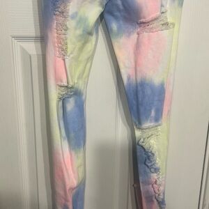 Stylish tie-dye jeans with a blend of pastel colors. Features a trendy distressed design for a modern look.