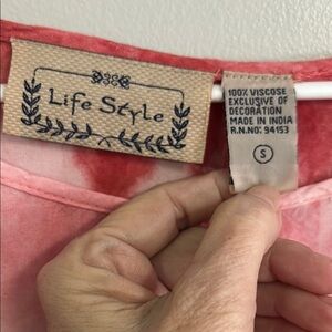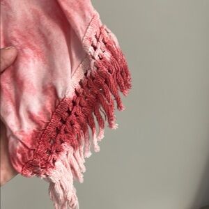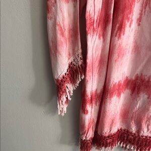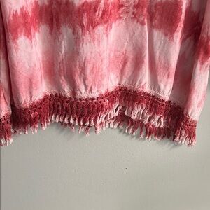Add a splash of color to your wardrobe with this stylish tie-dye top. Featuring a vibrant red and white design, this top is perfect for casual outings. The fringe hem adds a trendy touch.