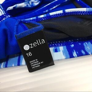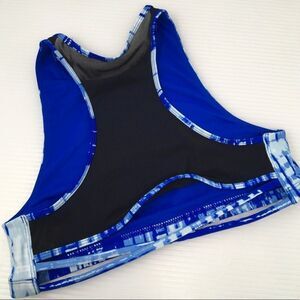 Blue and white tie-dye sports bra featuring a mesh racer back and extra straps for added support and fashion