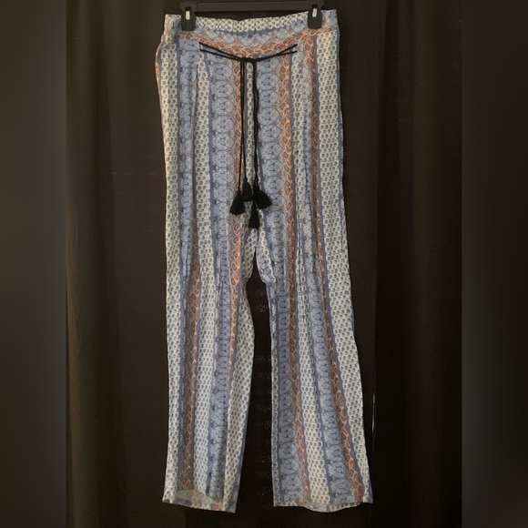 Tied, straight leg, beach pants. Tassel for the waistband. Paisley pattern. Light blue and light orange. Flowy material. Brand: bebop. size large