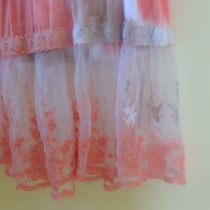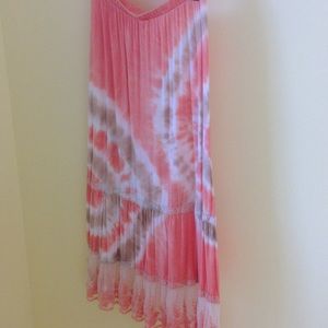 Super comfy, convertible dress/skirt! Deep peach, tan, creamy white tie-dye. This is super-fun, T-shirt fabric comfy! The lace across the bottom makes it fabulous, almost a coral color, as well as some tan. Simple stretch waistband. Love this skirt! Too warm in Florida...I am 5'3"; as a dress, shin length, as a skirt, on the floor. VGUC. No pilling. The colors are actually as they appear in the cover pic.