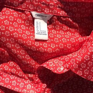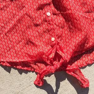 This top is absolutely adorable! Ties in the front and shows some belly. Buttons all the way up with a collar on top and two front pockets.