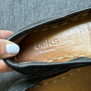 The Tieks Black Leather Ballet Flats in size 8 are perfect for women on-the-go who value both style and comfort. These foldable flats are ideal for travel, as they take up minimal space in luggage and are easy to slip on for long flights or train rides. The sleek black color and ballet style design add a touch of elegance to any outfit, making them a versatile and practical choice for any wardrobe. Crafted from high-quality leather, these flats offer durability and long-lasting wear for all your adventures.