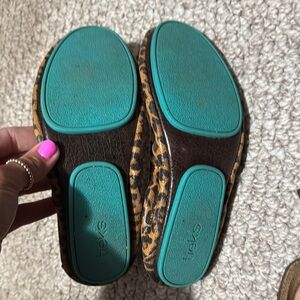 Experience the perfect blend of style and comfort with these Tieks flats, featuring a striking brown and black leopard print. Designed with a soft, suede-like material and a rounded toe, these shoes offer a snug fit with their elastic edges. Ideal for adding a bold touch to any outfit, these flats are a must-have for your shoe collection.