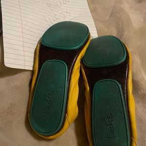 GUC Tieks Mustard Size 9. Comes with flower and an unused bottle of Angelus yellow paint. The left shoe has a mark on the heel. The right shoe has a loose thread on the inside. Mild patina, no smells. Soles are perfect.
