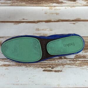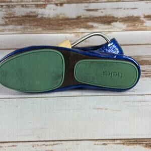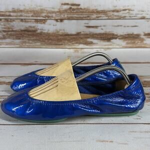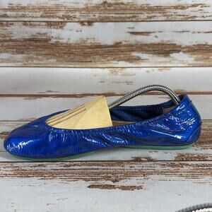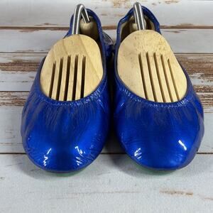 TIEKS by Gavrieli ballet flats in Sapphire blue patent leather. Signature foldable design with cushioned insoles and split rubber soles for comfort and portability. Size 10. Vibrant jewel-tone finish with teal soles.