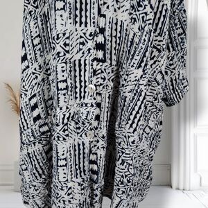 Button front extremely oversized midi dress/tunic with shirt tail hem, mother of pearl buttons, 3/4 to long sleeves, woven fabric in a tribal print. Patch pockets.
