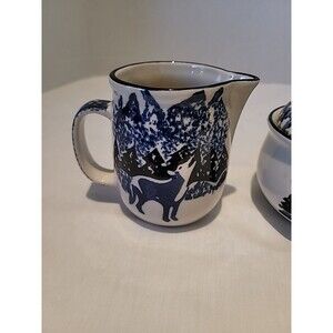 Tienshan Folk Craft WOLF Vtg Creamer Pitcher & Sugar Bowl Lot Blue Sponge