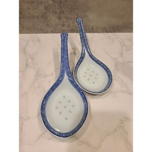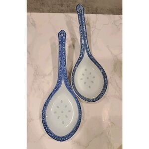 Set of 2 Tienshan Translucent Rice Grain Blue & White Design 9" long x 3.25" wide Large Serving Spoons Excellent Used Vintage Condition | No chips or cracks | Please refer to the photos for the condition |"Weight before packaging 8oz.