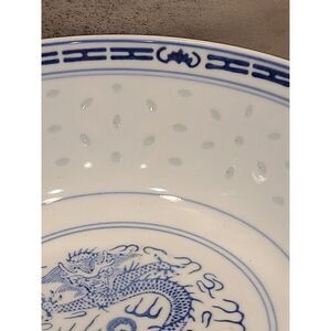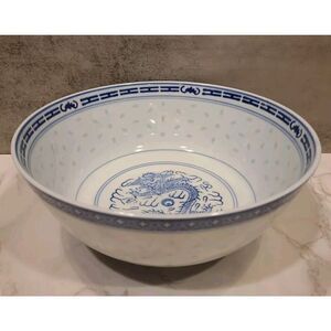 Tienshan Translucent Rice Grain Blue/ White Colorway with Dragon & Bats design | Serving Bowl / Soup Bowl | 8" x 3.25" | | Excellent Used Vintage Condition | No chips or cracks | Please refer to the photos for the condition | Weight before packaging 1.8 lbs.