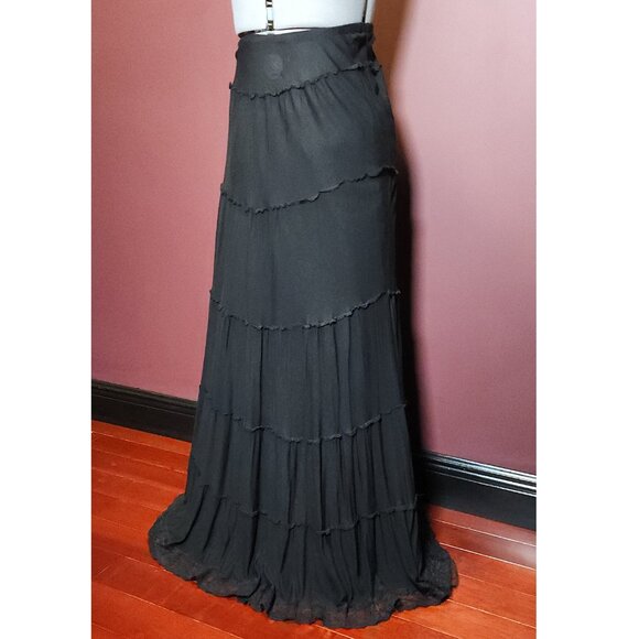 Black tiered maxi skirt. Soft, cool fabric, with black lace trim. Super lightweight, perfect as resort wear or a beach cover up.