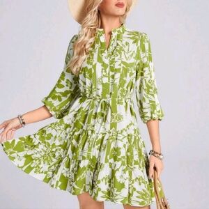 Tiered Button Down Dress With Waist Tie In Green,Bohemian,Western Wear Women