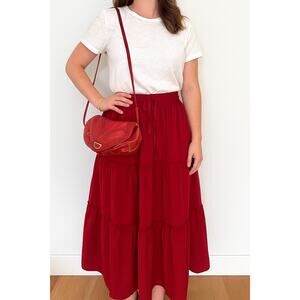 Add a romantic, bohemian touch to your closet with this deep red tiered maxi skirt. Featuring a flowy silhouette, elastic waistband with drawstring, and three gathered tiers, this versatile piece transitions effortlessly from casual daywear to a cozy fall layering staple.