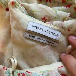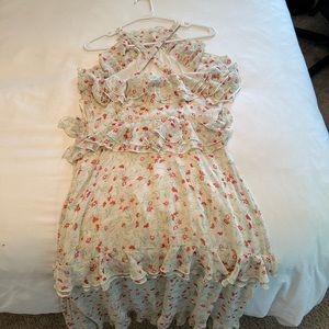 Cream background with red and green floral! Tiered dress with ruffle and shoulder straps that cross in the back. Size 8. Only worn once! MIDI length.