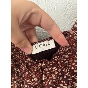This dress from Storia is characterized by its dark red base color and a pattern of small white and pink flowers. The dress is a mini-length style with thin spaghetti straps and a V-neckline. It features an empire waist with ruching or gathering details that create a slightly fitted bodice before flowing into a looser, tiered skirt.