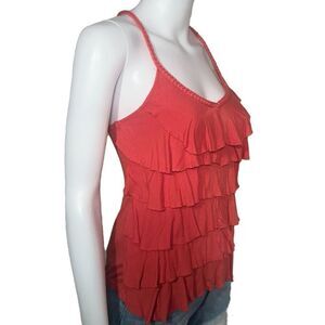 Women’s small tiered ruffle top in dusty orange color, braided neckline and straps that are adjustable from the back. This top lays beautifully and is super flattering on! Excellent preloved condition (no stains, tears, holes or major sign of wear).