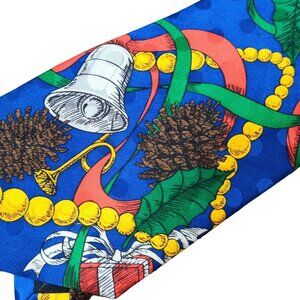 Elevate your holiday wardrobe with this festive Christmas themed necktie. Crafted from 100% silk, it features vibrant designs of bells, pinecones, and gifts.