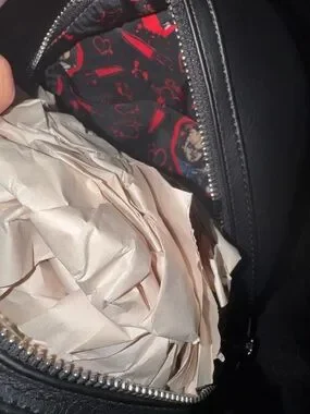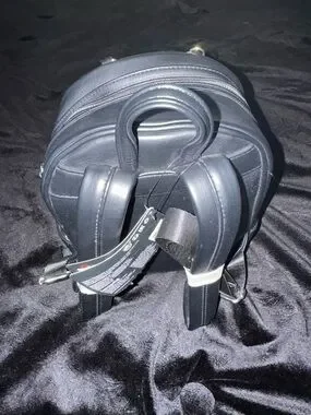 Tiffany black and white mini backpack with stylized front panel and gold-tone chain accent. Compact design with zip closure and adjustable straps. Clean, modern look that complements casual and edgy outfits. Gold hardware adds a polished finish.
