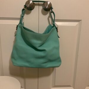 This Hobo is made of natural grain Italian leather with palladium-plated solid brass hardware. Tiffany Blue® leather lining with three small interior pockets, a zipper compartment and a key ring. Magnetic closure. Single adjustable shoulder strap.