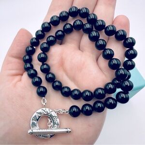 Gorgeous classic toggle necklace crafted in sterling silver. Black onyx beads.