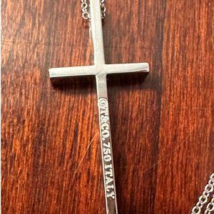 This was a gift that was never worn. In perfect condition. An authentic Tiffany & Co. Metro Cross necklace. In the Tiffany & Co. blue box with a black velvet Tiffany jewelry box inside with gold text on the top inside of the box that says: Tiffany & Co. It is a simple yet elegant 18K white gold cross on an 18", 18K white gold chain with a lobster claw clasp. The cross is 1 1/4" long x 1/2" wide. The back of the cross has a tiny engraving of @T&CO. 750 ITALY. Could be worn by a young person, woman or man.
