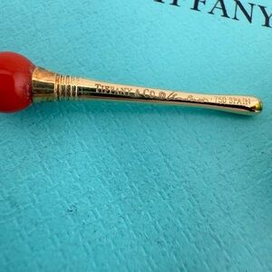 One of Elsa Peretti's first jewelry designs. Pendant in 18k gold with a removable stopper of hand-carved coral bead. On a 24" chain. 35 x 28 mm. Original designs copyrighted by Elsa Peretti.