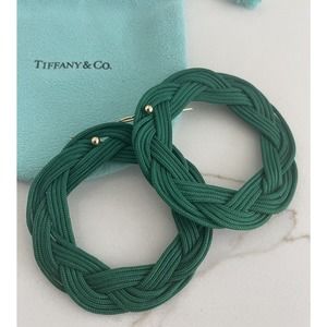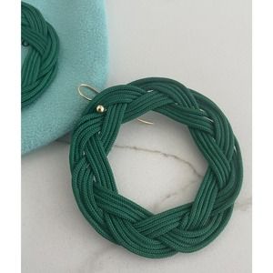 Tiffany & Co. 18k Gold 750 Elsa Peretti Circle hook earrings in green woven silk