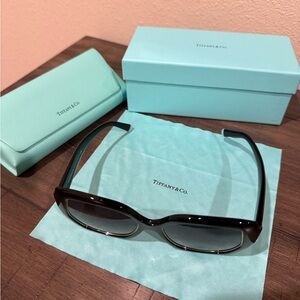Elegant black sunglasses with blue-tinted lenses. Includes Tiffany & Co. packaging.