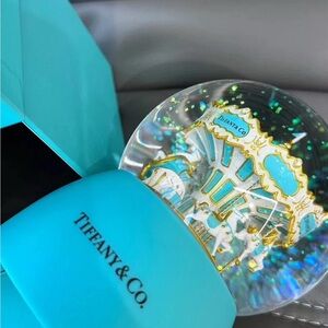 Elegant snow globe with a carousel design. Features Tiffany blue and gold accents. Perfect for collectors.