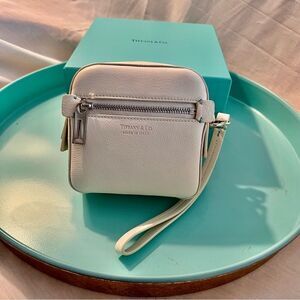 In pristine condition. Kept in original blue box and blue pouch, ready for gifting. No blemishes on the bag. This is an authentic Tiffany & Co. white leather camera wristlet bag.