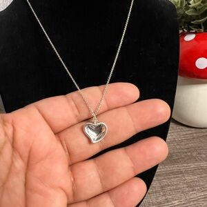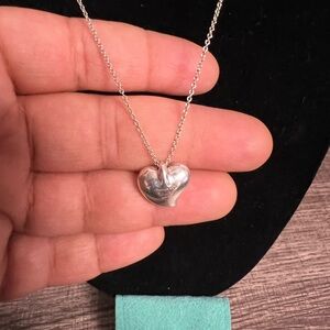 Preloved concave heart necklace, 16 in, sterling silver 925. Original Tiffany chain. Comes with Tiffany storage bag ( note button on bag is loose). Happy shopping