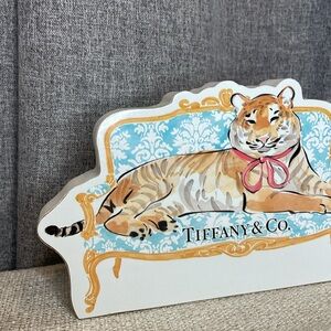 Charming Tiffany & Co. plaque featuring a tiger on a blue and gold sofa. Perfect for adding elegance to any space.