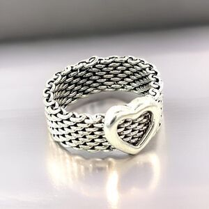 The Tiffany & Co. Somerset Mesh Weave Sterling Silver Ladies Ring with a Silver Heart in the front is a delicate and elegant piece of jewelry that exemplifies the brand's signature blend of craftsmanship and timeless design.