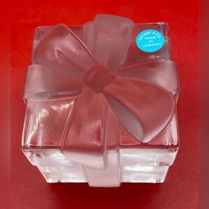 Elegant frosted glass gift box. Features a pink ribbon accent. Perfect for home decor.