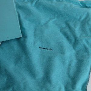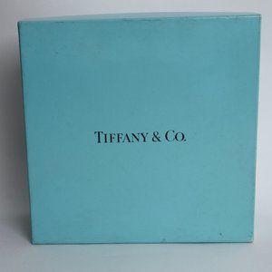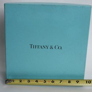 A Tiffany & Co box that measures 9.5" X 9.5". Box shows signs of shelf wear. The string bag measures about 12"X9.5" Bag in excellent condition as it has been kept inside its box. See all photos for additional description.