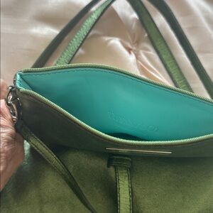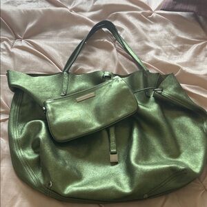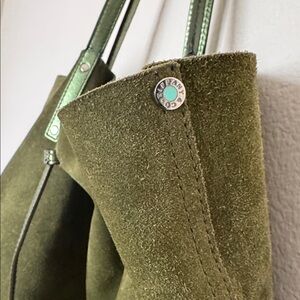 Hard to find Tiffany & Co reversible tote bag shimmering metallic green leather with green suede interior. This rare design can be flipped inside out for two stylish looks. Includes the original zip pouch. Slight tear on one strap. This stylish green tote bag is perfect for any occasion. Its sleek design and vibrant color make it a must-have accessory. Gently used.