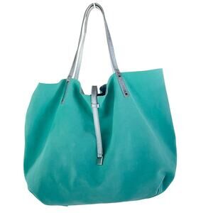 Hard-to-find Tiffany & Co. reversible tote bag in shimmering metallic silver leather, with the iconic Tiffany Blue suede interior. This rare design can be flipped inside out for two stylish looks in one. Includes the original matching zip pouch—an uncommon set.